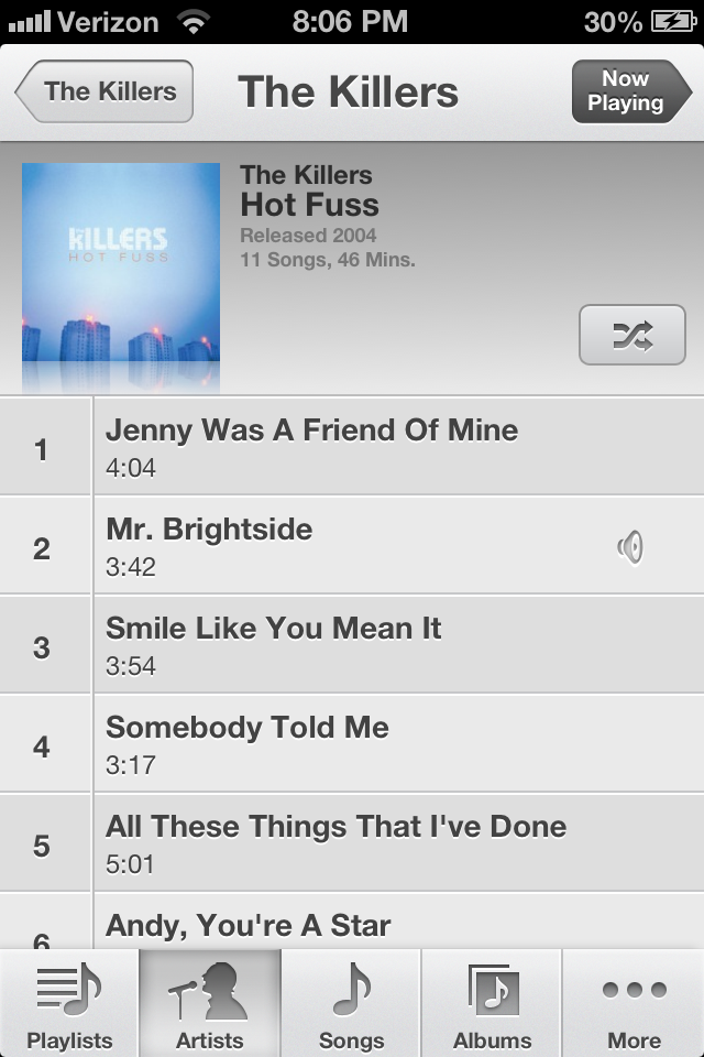 is on my list of Top Five Favorite Albums Ever. By that I mean I love it from start to finish. Every song is friggin’ fantastic. I am so glad that instead of letting individual songs pop up on my shuffle by chance, I deliberately played the whole album from start to finish at work this week and re-appreciated it.  It also gave the work day a needed boost.  Thanks, The Killers.