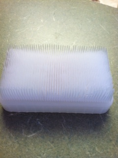In the past, we’ve also used sensory brushes to “brush” M. There’s a method to the madness– a certain technique that we were taught by an occupational therapist. The theory is, that done correctly, the brushing provides sensory stimulation and positively affects the joints. This is what our brush looks like. It’s made of soft plastic and doesn’t hurt.