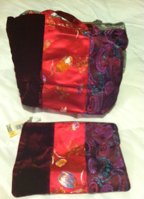 Guess how many times I’ve used these bags in all? Probably a total of ten times. If you look at the colorful bag above, with its matching makeup bag, you can still see the price tag on it. And, here’s a picture of the inside of the Anthro bag…