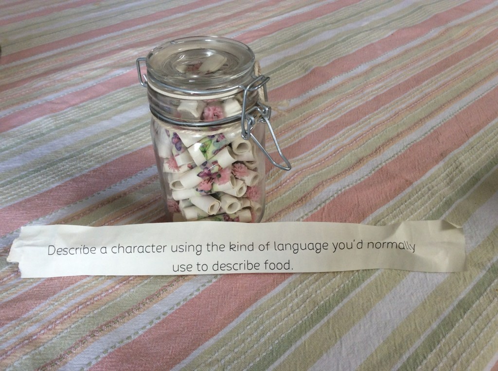 A few years ago I received a thank you gift for helping to organize a writing conference. It’s a jar, with little rolled up papers in it. Each paper has a writing prompt. Here’s a pic…